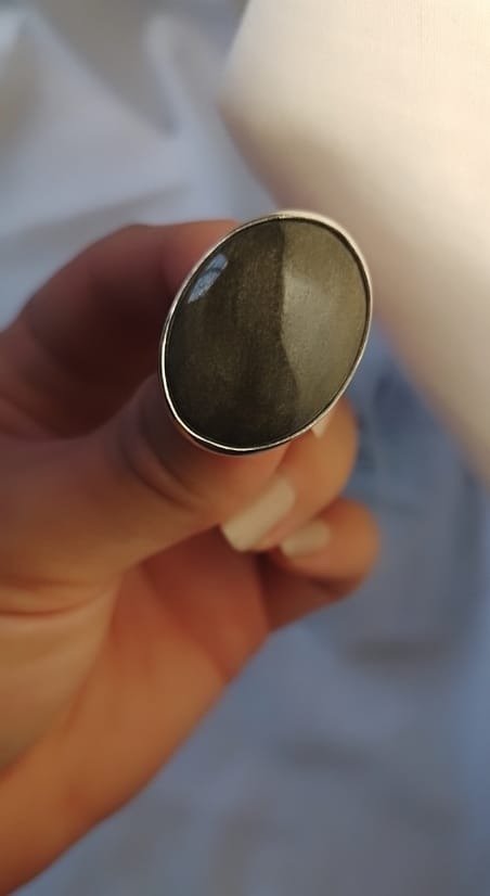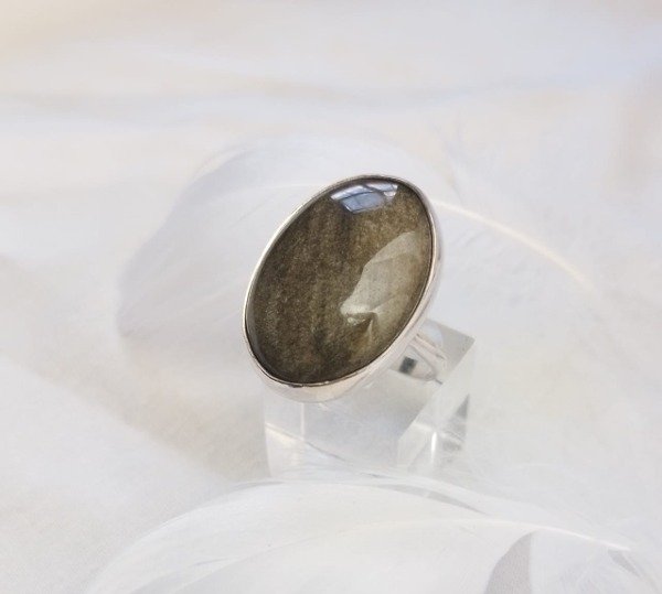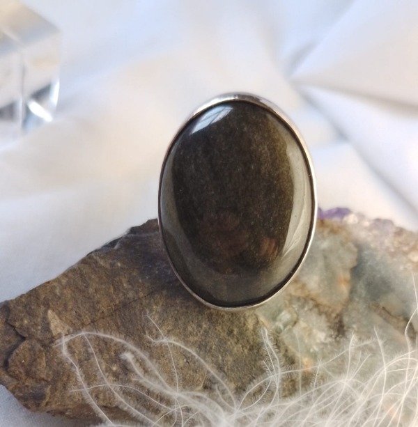 Anillo en plata 925 y piedra natural obsidiana dorada en forma de cabujón.