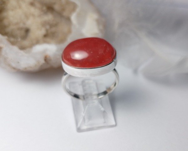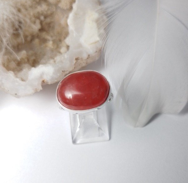 Anillo en plata 925 y piedra natural rodocrosita de forma cabujon.