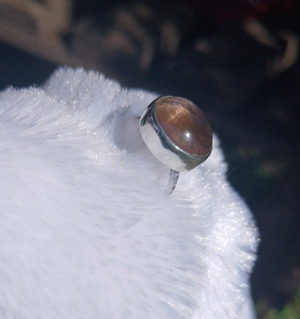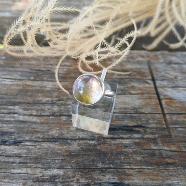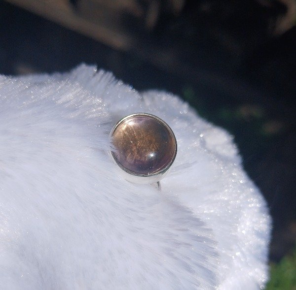 Anillo artesanal en plata 925, con piedra natural de ametrino en corte cabujón de aproximadamente 12 mm.