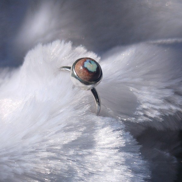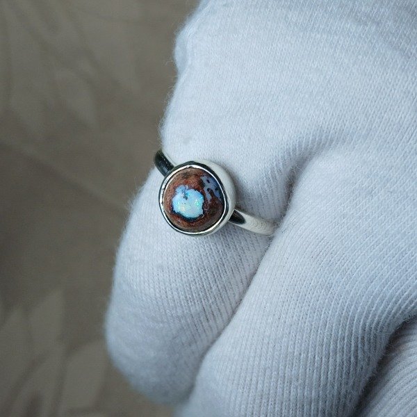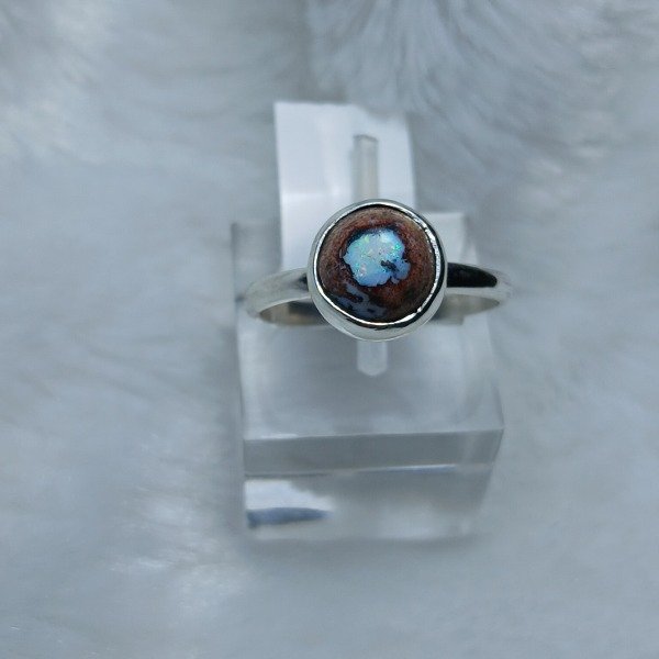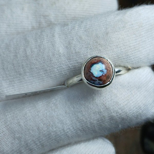 Un tesoro encapsulado en el tiempo: este anillo con Ópalo Cantera talla 15 posee una piedra de 7mm aprox., cuyas tonalidades verdes y rojizas parecen guardar secretos