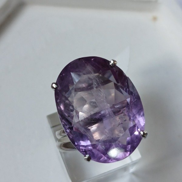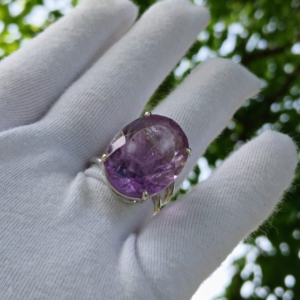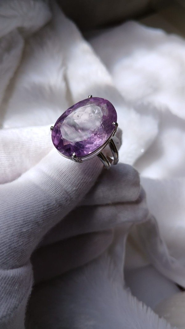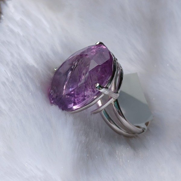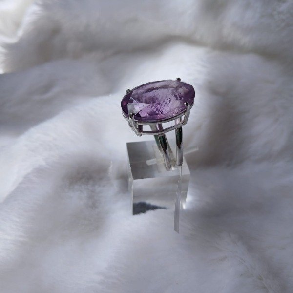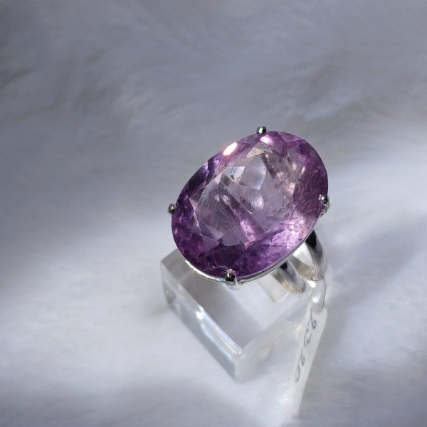 Realizado en plata 925, este diseño artesanal sostiene una amatista natural facetada de 16 x 23 mm, en talle 20.