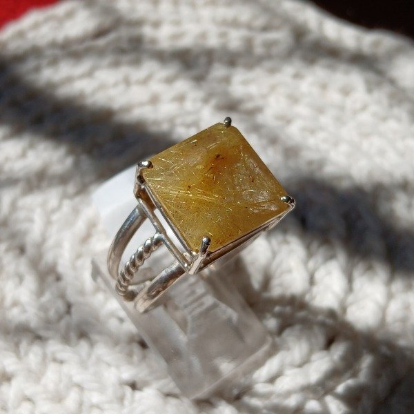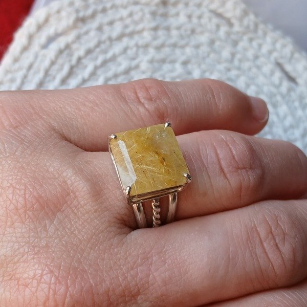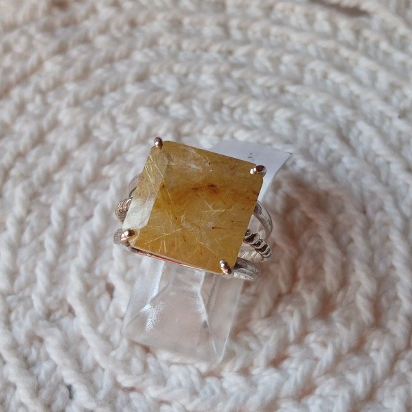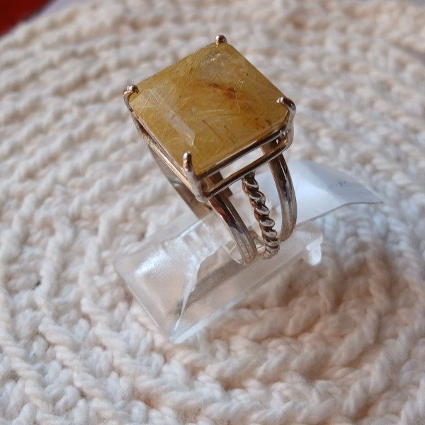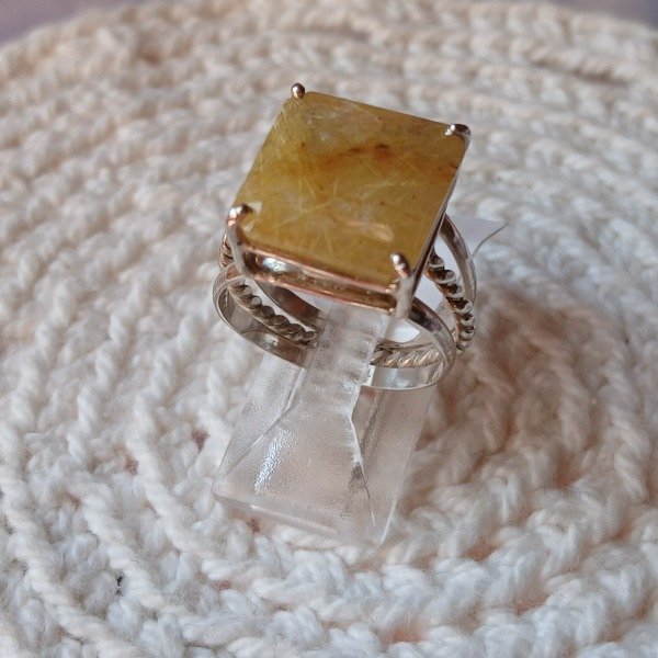Anillo en plata 925 y piedra natural cuarzo con rutilo dorado.