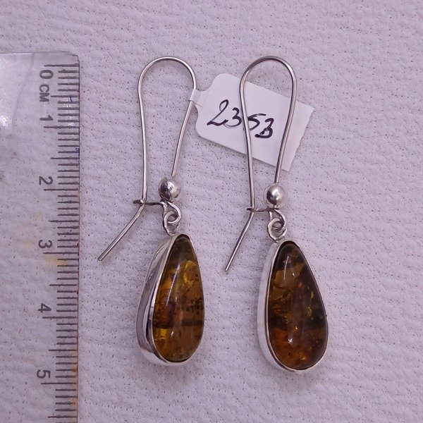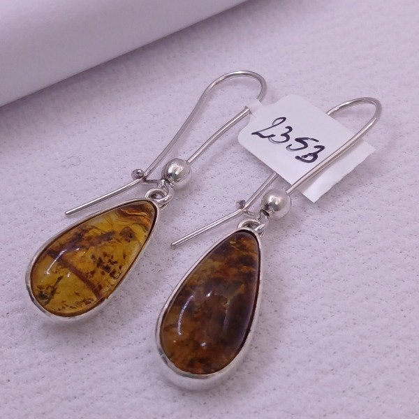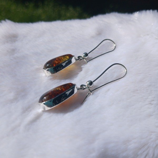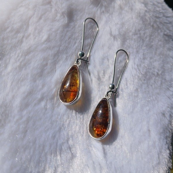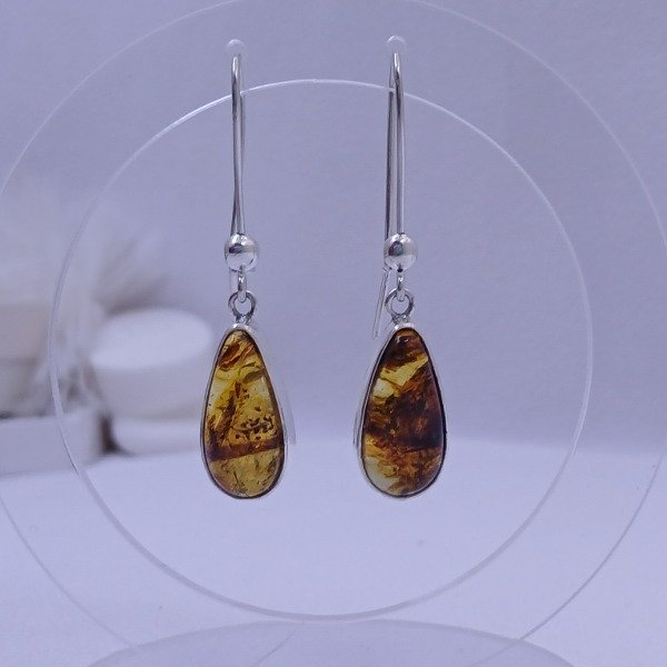 Aros en plata 925 con ámbar mexicano en forma de lágrima. Estas piezas son de excelente calidad, con brillo cálido y tonos dorados que aportan elegancia y distinción.