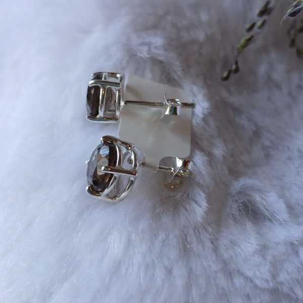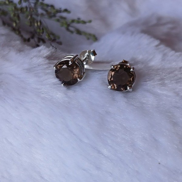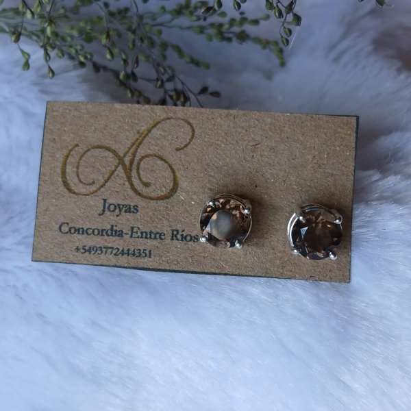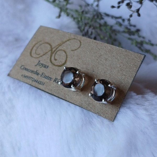 Aros en plata 925 y piedra natural cuarzo ahumado redondo facetado.