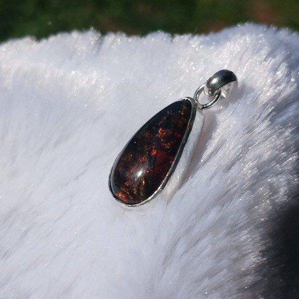 Dije elaborado con ámbar natural de México, de calidad superior. su forma de lagrima pulida, presenta tonos intensos que realzan su belleza y transparencia.