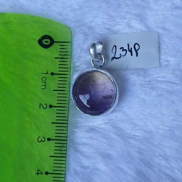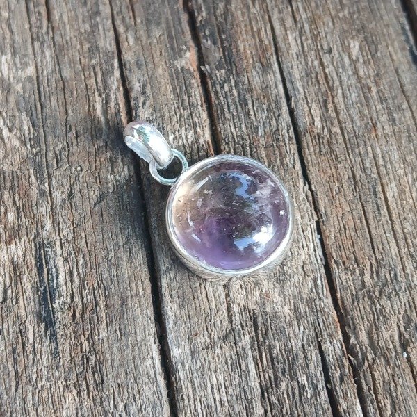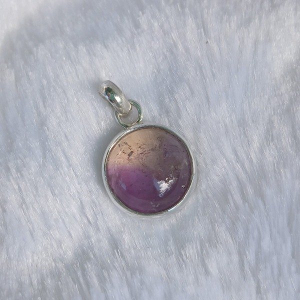Dije artesanal en plata 925, con piedra natural de ametrino en corte cabujón redondo de aproximadamente 13 mm.