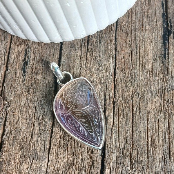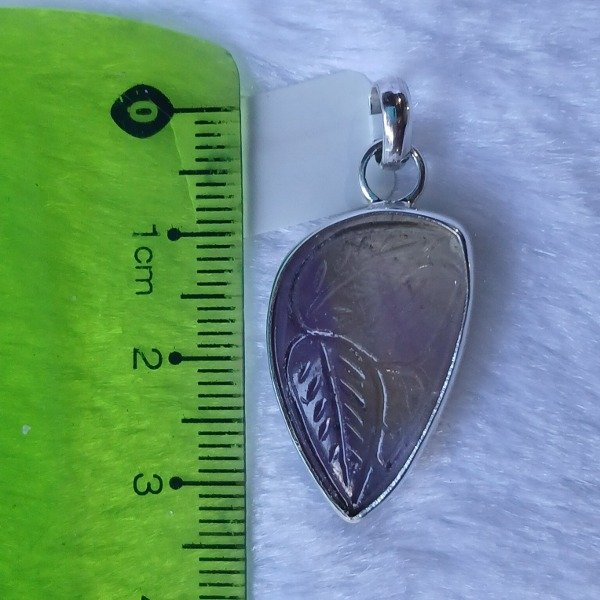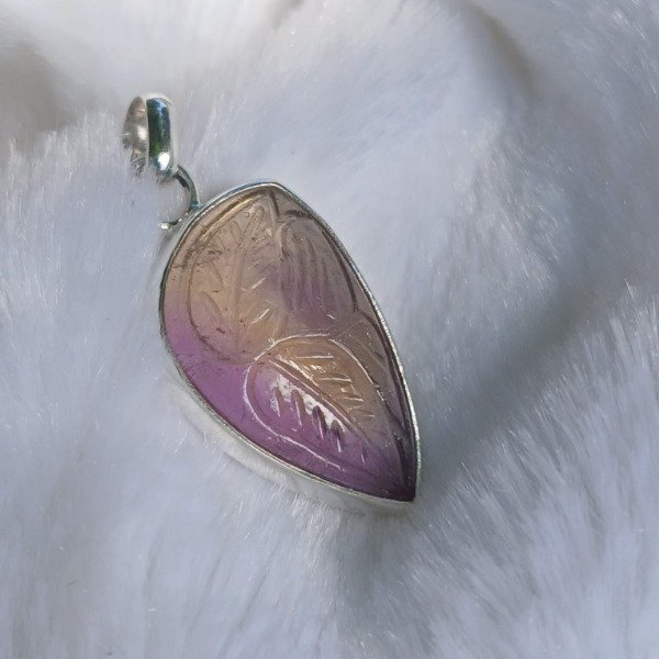 Dije artesanal en plata 925, con piedra natural de ametrino tallada completamente a mano, su forma es libre de aproximadamente 14x24 mm.