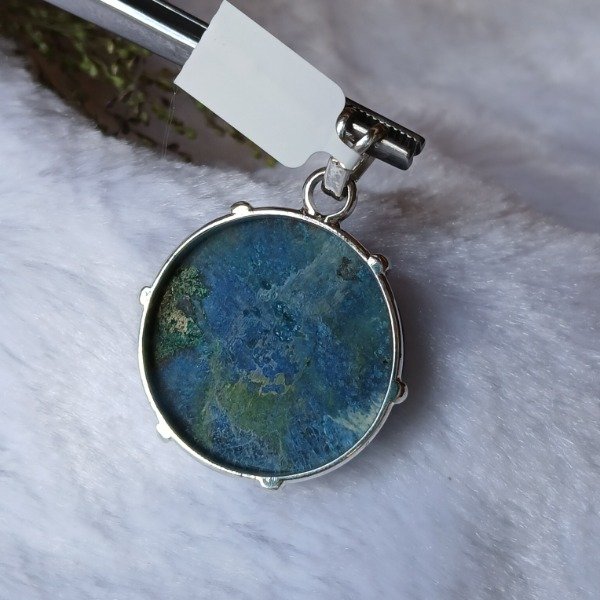 Cada piedra, de 28 mm aprox., está engarzada artesanalmente en plata 925, resaltando sus vetas y texturas únicas.
