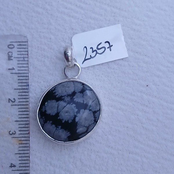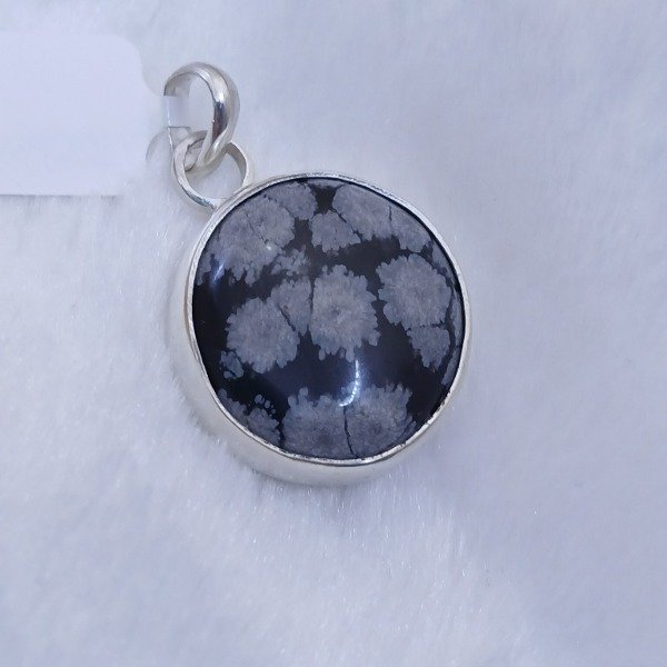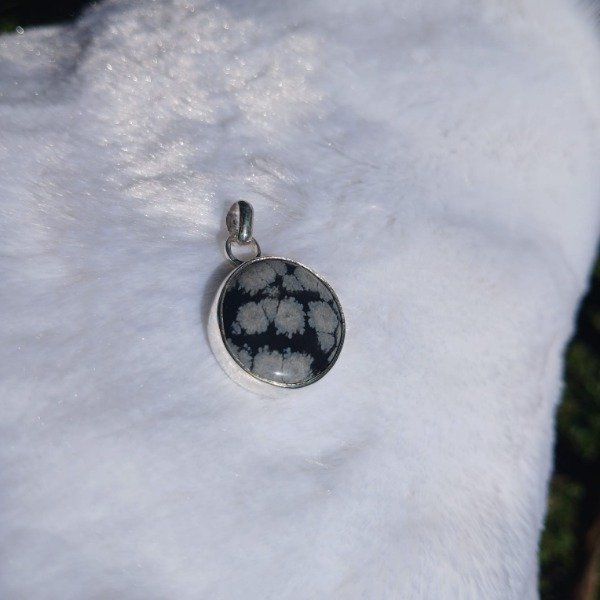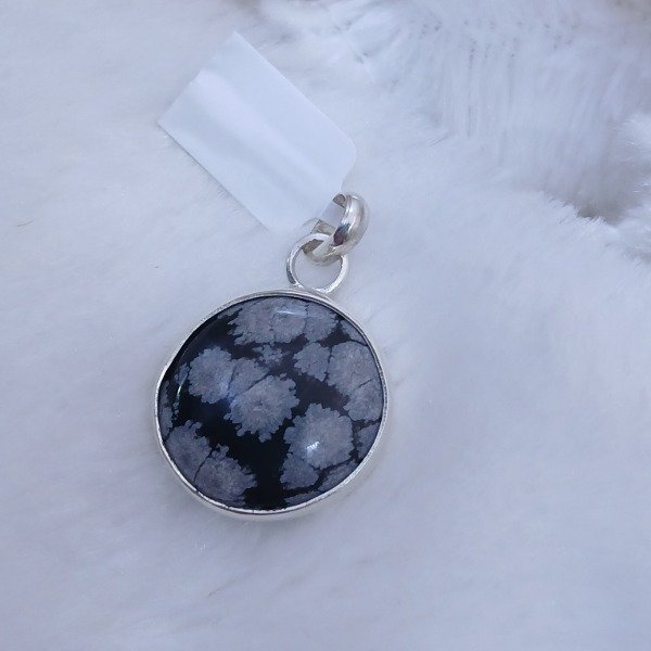 Dije elaborado en plata 925 con piedra natural de obsidiana nevada de aproximadamente 19 mm.