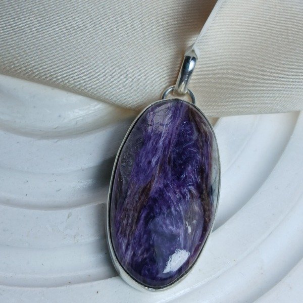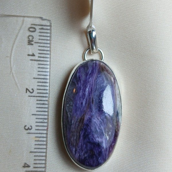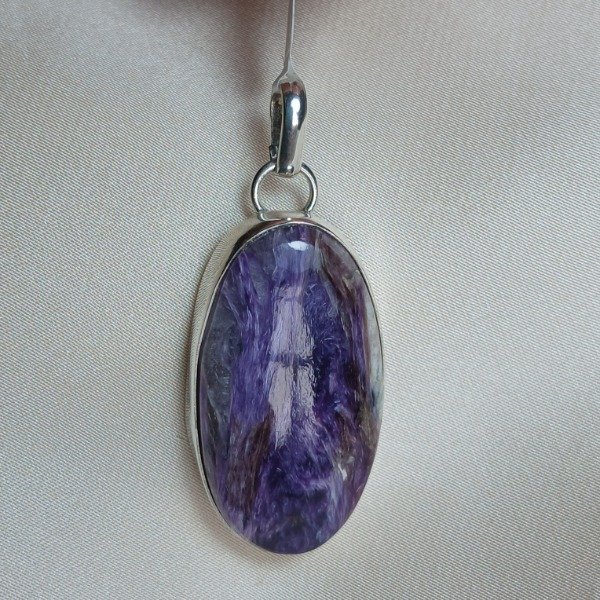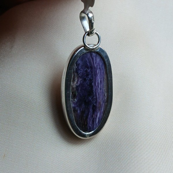 Dije en plata 925 y piedra natural charoita de forma cabujon.