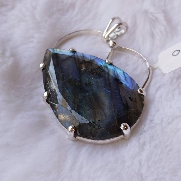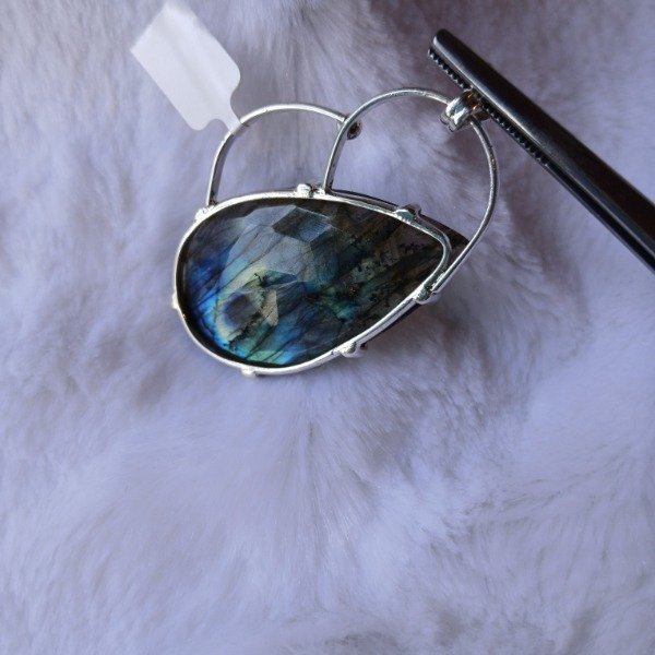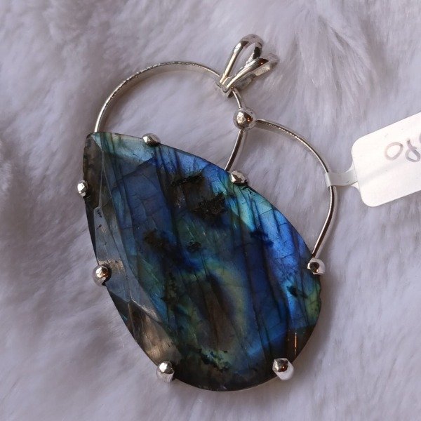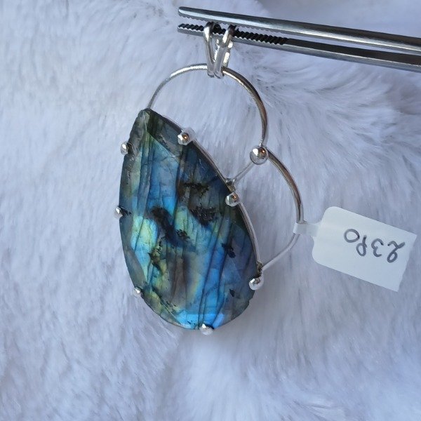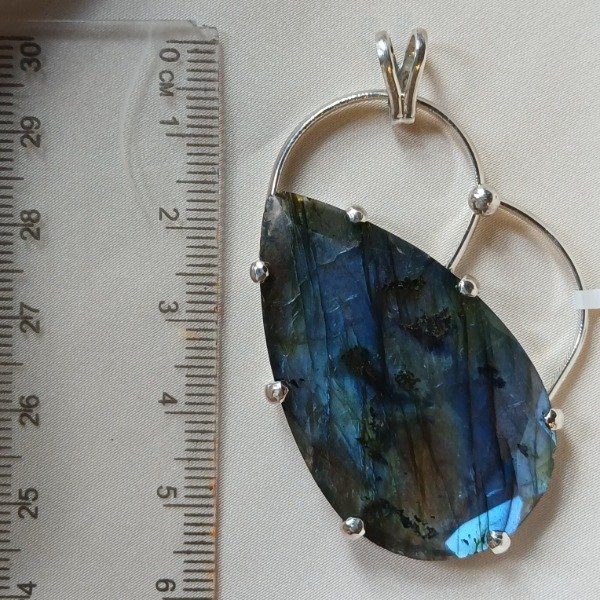 Este dije presenta una labradorita natural en forma de gota, con tonalidades azules, verdes y un sutil toque marrón, de 25 x 43 mm aprox., destacando su brillo y efecto iridiscente.